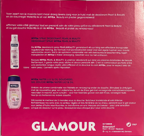 Nivea Glamour Geschenkset met douchegel, deodorant en spiegeltje.