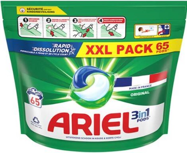 Ariel 3 in 1 pods original 60 wasbeurten. Doos van 2 stuks. Stuksprijs: €14,40